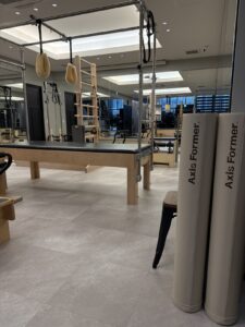 スタジオ内にはアクシスフォーマーをはじめ、複数のピラティスマシンが整然と配置されていました。このような本格的なスタジオでご採用いただいていることは、私たちにとって大きな励みとなっております。